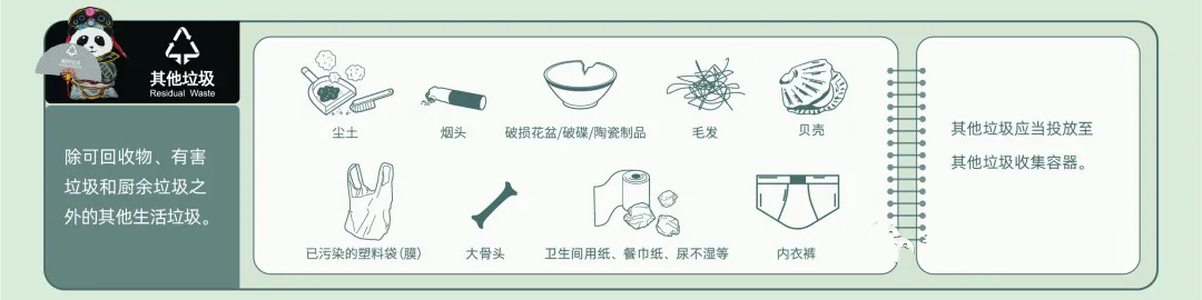 其他垃圾,指除有害垃圾、可回收物、廚余垃圾以外的其他生活廢棄物。大多數(shù)家用衛(wèi)生品、化妝品及化妝用具,以及復(fù)合型的。由多種材質(zhì)、部件組成卻難以拆解的產(chǎn)品,比如打火機(jī)、筆、傘等。